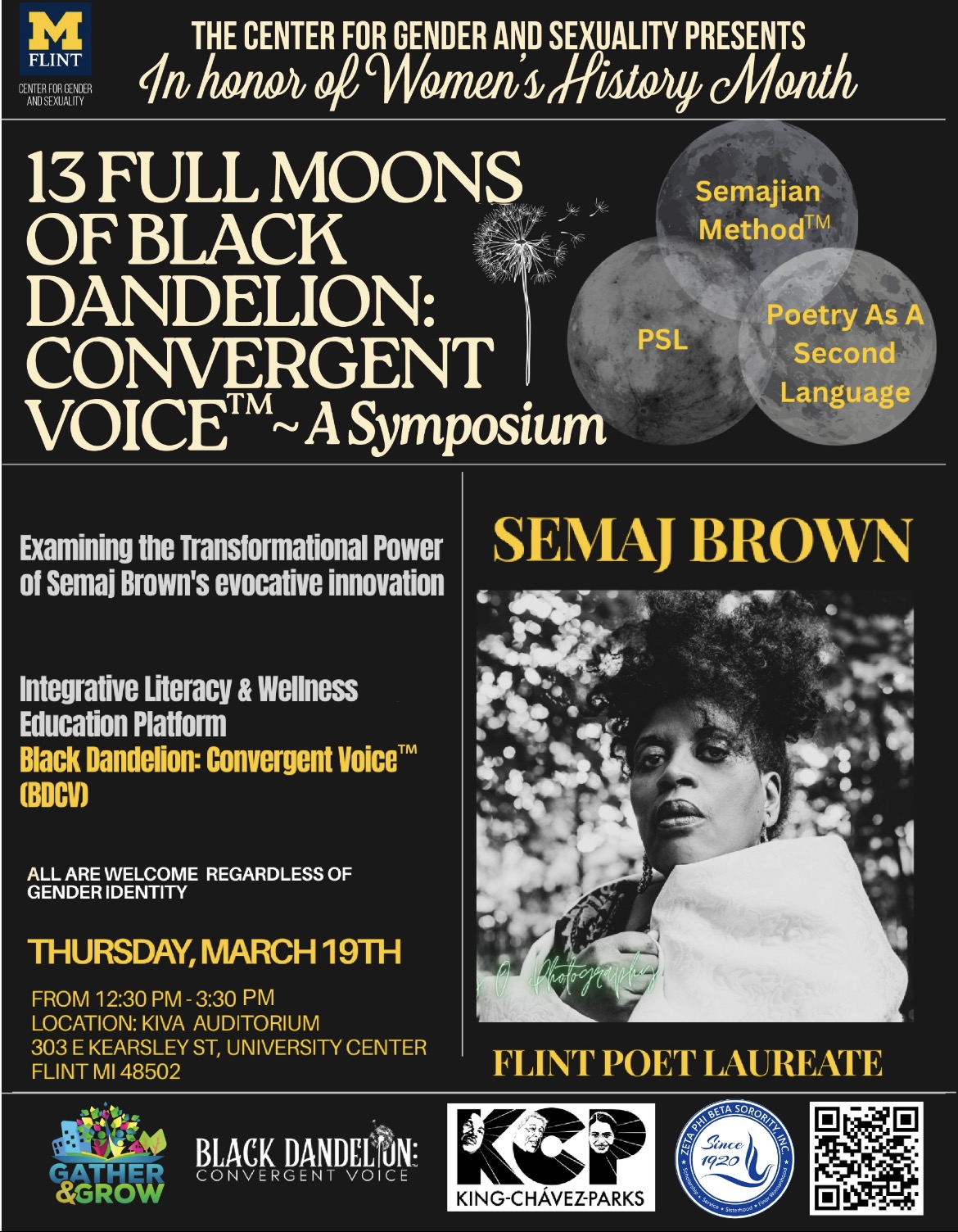The unique platform evolves into a symposium that will examine the transformational power of the internationally acclaimed poem, Black Dandelion, in honor of Women's History Month at The Center for Gender and Sexuality, University of Michigan-Flint.