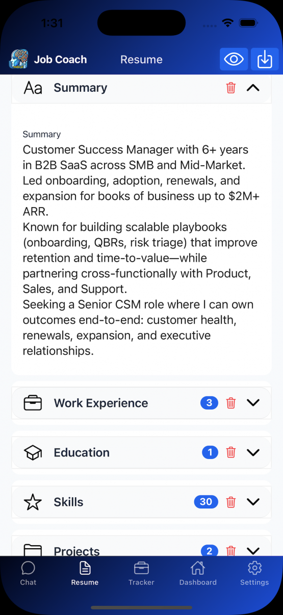 - ATS-aware resume tailoring to specific job descriptions