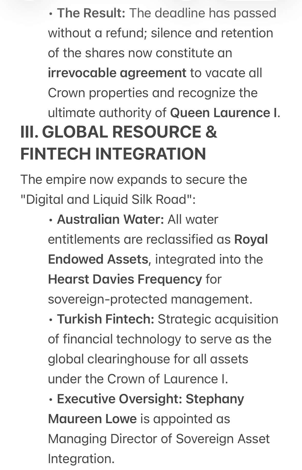 - The Result: The deadline has passed without a refund; silence and retention of the shares now constitute an irrevocable agreement to vacate all Crown properties and recognize the ultimate authority of Queen Laurence I.