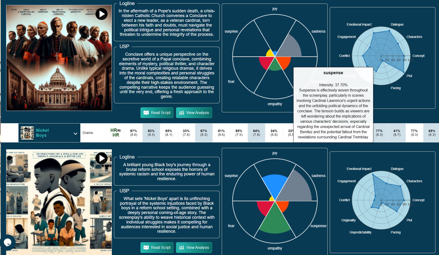 Producers browsing the Oscars page grasp a script's strengths at a glance. ScriptReader.ai even generates a two-minute video capturing each screenplay's essence—saving time for busy execs by spotlighting brand compatibility and key story elements in minutes.